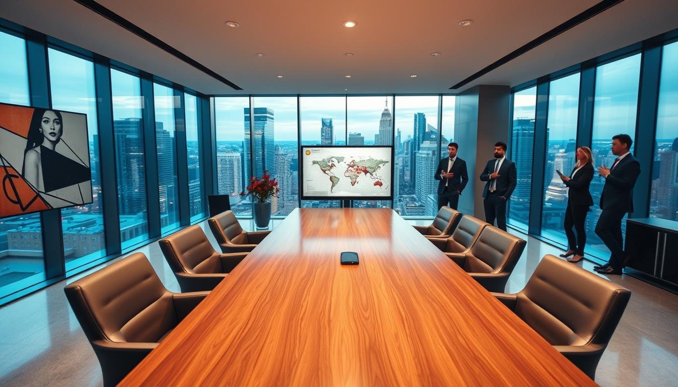 A high-rise office building with a modern, sleek design in the background. In the foreground, a group of business professionals dressed in formal attire are gathered around a conference table, engaged in a lively discussion. The lighting is bright and professional, casting subtle shadows across the scene. The atmosphere conveys a sense of excitement and anticipation, as if they are in the midst of an important announcement or fundraising event. The overall composition suggests a dynamic, forward-thinking financial institution poised for growth and expansion.