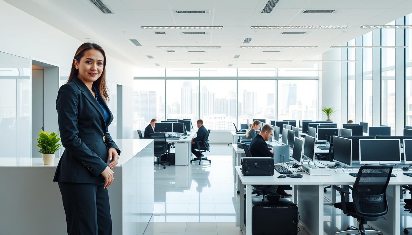A sleek, modern office interior with floor-to-ceiling windows overlooking a bustling city skyline. In the foreground, a desk with a laptop, tablet, and various digital devices symbolizing data brokerage and online information management. The middle ground features a large, holographic display projecting colorful visualizations of data flows and analytics. In the background, shelves filled with server racks and networking equipment, bathed in a cool, bluish lighting. The scene conveys a sense of technological sophistication, data-driven decision making, and the comprehensive coverage of online reputation management services.