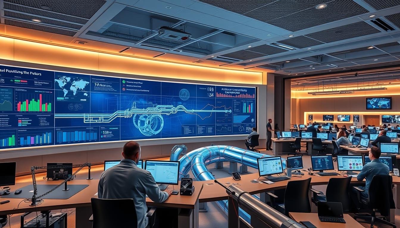 A sleek, modern office interior with large windows overlooking a bustling cityscape. In the foreground, a team of professionals collaborate around a stylish conference table, their expressions focused as they interact with a holographic display showcasing intricate data visualizations. The middle ground features a robotic assistant proactively tending to administrative tasks, seamlessly integrating AI-driven efficiency into the workflow. In the background, the city skyline glimmers with the promise of technological progress, underscoring how Pipes.AI's AI-powered pipeline management solutions elevate business operations. Soft, warm lighting creates an atmosphere of productivity and innovation, reflecting the transformative impact of AI on modern enterprises.